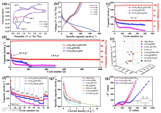 图3. (a) CoTe2/Sb2Te3@NCNFs电极在0.1 mV s−1扫速下的CV曲线和(b) 在0.2 A g−1时放电/充电曲线。CoTe2/Sb2Te3@NCNFs、CoTe2@NCNFs和CoTe2/Sb2Te3@NC电极在(c) 0.2 A g−1和(d) 1.0 A g−1下的循环性能 。(e) CoTe2/Sb2Te3@NCNFs与目前报道最多的CoTe2和Sb2Te3基负极的储钠性能比较。(f) CoTe2/Sb2Te3@NCNFs、CoTe2@NCNFs和CoTe2/Sb2Te3@NC电极的倍率性能。(g) CoTe2/Sb2Te3@NCNFs负极与先前报道的SIBs中Te基负极材料的倍率性能比较。(h) CoTe2/Sb2Te3@NCNFs、CoTe2@NCNFs和CoTe2/Sb2Te3@NC电极的EIS曲线及相应的等效电路,附图为等效电路。