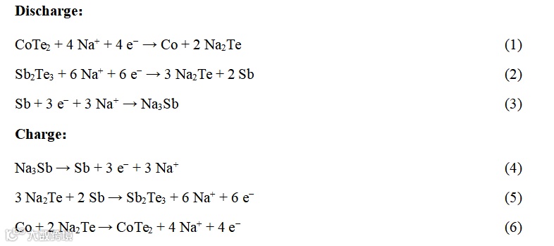 为了揭示CoTe2/Sb2Te3@NCNFs电极的钠储存机制,采用了非原位XRD结合非原位TEM进行表征。根据非原位XRD/XPS/TEM的分析结果和CV曲线,可以将的反应机理划分为6个阶段,描述如下: