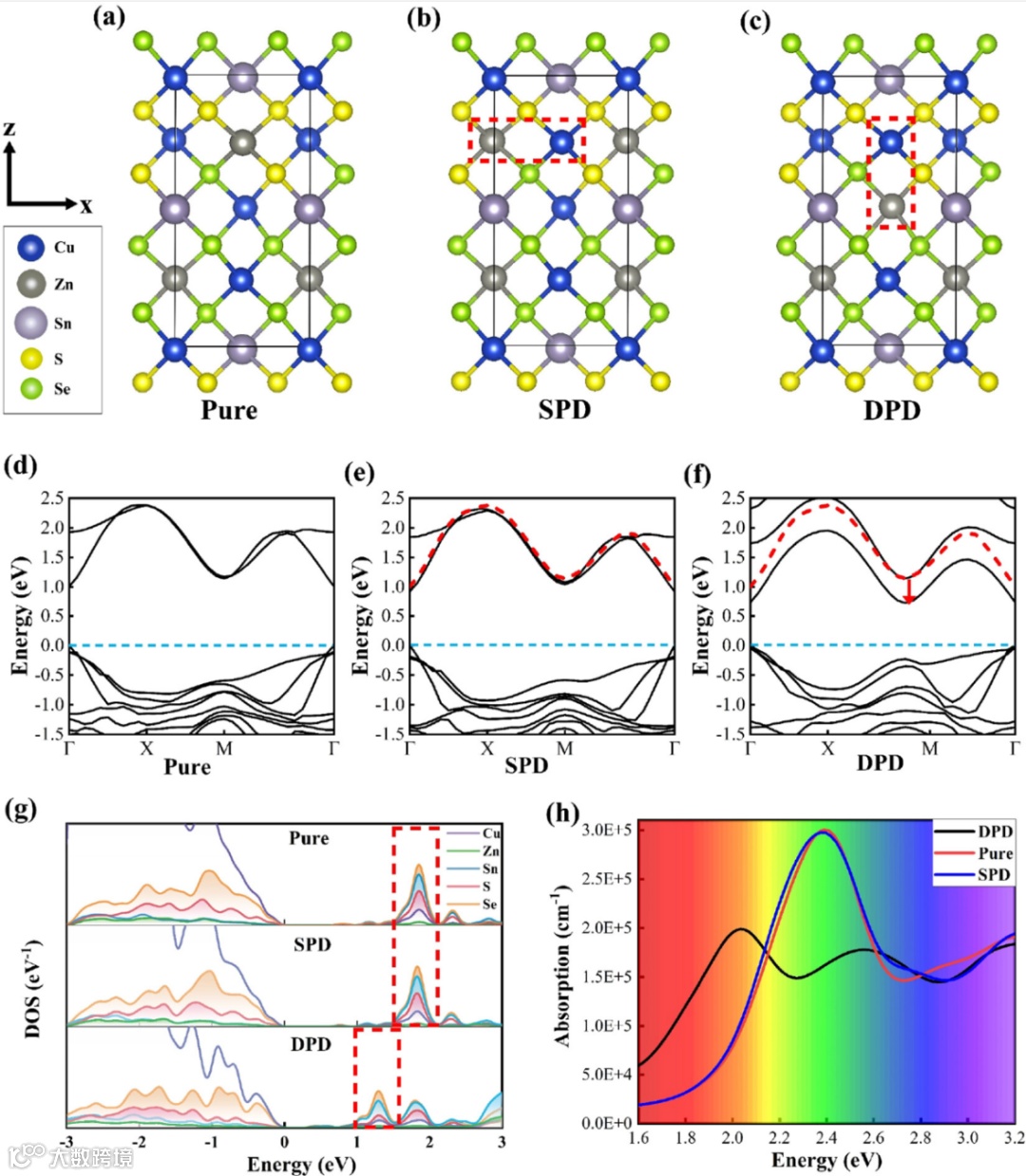 图1.铜锌锡硫及其两种Cu-Zn阳离子无序的结构图,以及三种结构的各种性质对比。