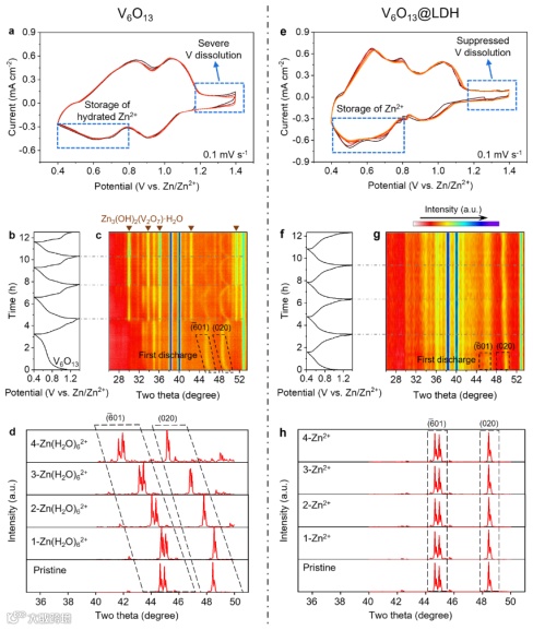 图4. V6O13和V6O13@LDH中的离子嵌入行为。(a-d)V6O13的电化学测试与表征,包括扫速为0.1 mV s-1的CV曲线(a),原位XRD表征和相应的充放电曲线(b,c),以及通过计算模拟的首次放电过程中V6O13衍射峰的位移(d)。(e-h)V6O13@LDH的电化学测试与表征,包括扫速为0.1 mV s-1的CV曲线(e),原位XRD表征和相应的充放电曲线(f,g),以及通过计算模拟的首次放电过程中V6O13衍射峰的位移(h)。