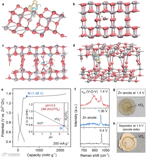 图2. V6O13在水中溶解行为的理论与实验研究。(a-d)DFT计算得出的差分电荷密度图(灰色、红色和白色的球分别代表V、O和H原子,黄色和蓝色的区域分别代表电荷的失去和获得。(a)自由H2O与V6O13暴露的(011)面之间的相互作用。(b)自由H2O与V6O13体相之间的相互作用。(c)嵌入的水合Zn2+中的H2O与V6O13之间的相互作用。(d)水合Zn2+嵌入后,电解液中的游离H2O与V6O13之间的相互作用。(e)在0.2 A g-1电流密度下Zn||V6O13电池的恒流充放电曲线。附图为V-H2O Pourbaix图。(f)首次循环过程中不同充放电态下锌负极的拉曼光谱。(g,h)首次充电至1.4 V时锌负极(g)和负极侧隔膜的光学图片(h)。
