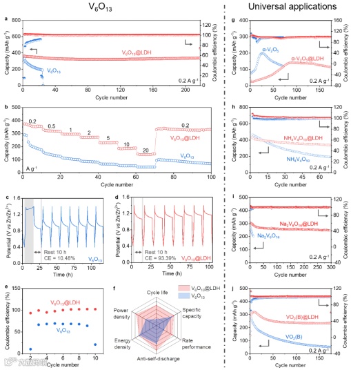 图5. ZnOTf-LDH人工CEI的综合性能及普适性应用。(a)V6O13和V6O13@LDH在0.2 A g-1电流密度下的循环性能。(b)V6O13和V6O13@LDH在不同电流密度下的倍率性能。(c-e)V6O13和V6O13@LDH的自放电性能。电流密度为0.2 A g-1。(e)为(c)和(d)的统计图。(f)V6O13和V6O13@LDH的循环寿命、比容量、倍率性能、抗自放电、能量密度、功率密度的雷达图。(g-j)α-V2O5和α-V2O5@LDH(g)、NH4V4O10和NH4V4O10@LDH(h)、Na2V6O16和Na2V6O16@LDH(i)、VO2(B)和VO2(B)@LDH(j)在0.2 A g-1电流密度下的循环性能。