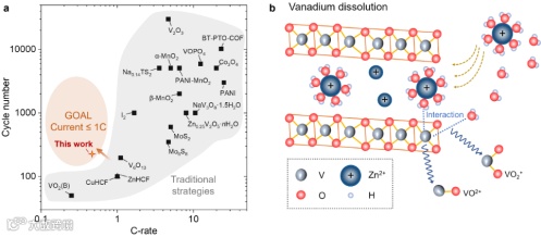 图1. AZIBs正极材料的循环性能统计和V电极的溶解示意图。(a)已发表的AZIBs正极材料在不同电流倍率下的稳定循环圈数。(b)氧化钒正极在AZIBs中的溶解示意图。VO2+和VO2+是典型的溶解产物。