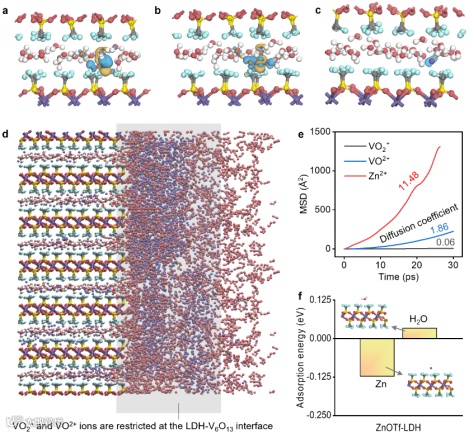 图3. 优化后的ZnOTf-LDH结构以及相应的VO2+、VO2+、Zn2+和H2O与ZnOTf-LDH间的相互作用。(a-c)VO2+(a)、VO2+(b)和Zn2+(c)分别在ZnOTf-LDH中的差分电荷密度图。(d)界面处ZnOTf-LDH对VO2+和VO2+的限制效应示意图。(e)不同离子在ZnOTf-LDH中的均方位移。(f)ZnOTf-LDH通道中Zn2+和H2O的吸附能。