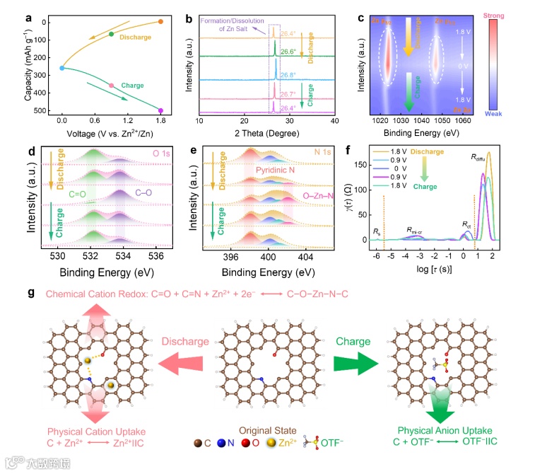 研究人员通过电化学分析以及异位表征技术对不同充电/放电状态的CSDMF碳阴极进行研究。结果表明,碳骨架上的氮/氧活性基团(C=N/C=O)倾向于通过可逆的化学吸附以形成C−O−Zn−N−C的结构,同时保持高效的电荷转移,即使在高倍率下也能最大限度地减少容量损失。结合常规的化学吸附,提出了一种新颖的储能机制,即阴阳离子(Zn2+/OTF−)交替吸附在碳骨架缺陷上,以此来提高电容器电荷存储容量(240 mAh g−1)。