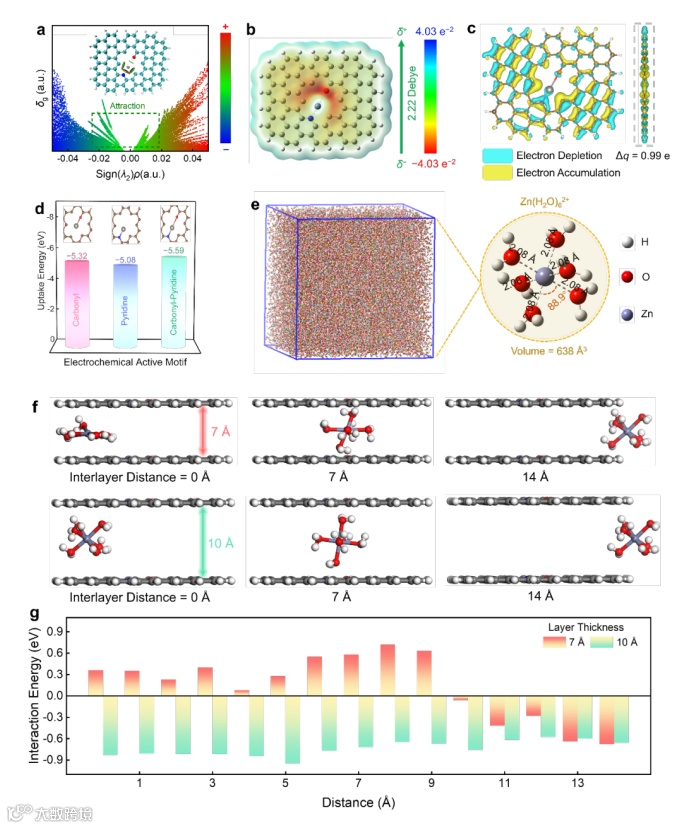 研究人员还通过独立梯度模型验证了碳超结构中的O/N活性位点与Zn2+存在强烈的耦合作用,同时再次利用分子动力学模拟研究了Zn2+的溶剂化扩散行为,Zn2+在大于1 nm微孔的孔中的扩散表现出较低的能垒,但受到小于0.7 nm微孔阻碍。