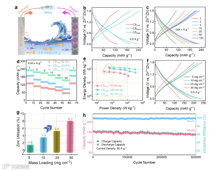 研究人员将锌阳极、碳阴极、3 M Zn(CF3SO3)2作为电解液组装成纽扣电池。通过电化学测试,表明通过汉森溶解度参数的指导策略,锌离子混合电容器中CSDMF基器件具有最优异的性能。同时,CSDMF基器件在30万次循环后,容量保持率为90.9%,库伦效率接近100%,实现了高能量密度(145 Wh kg−1)。