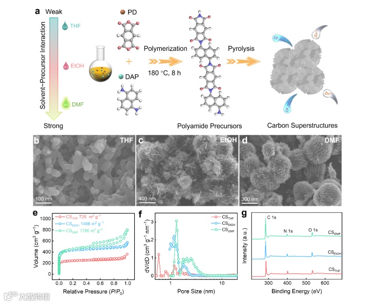 在这项研究中,研究人员展示了一种系统的溶剂-前驱体相互作用策略,用于设计具有纳米球理化特性的二元异质碳超纳米结构。通过定制溶剂与聚合物的相容性,可以系统地诱导前驱体的生长动力学,从而获得具有可调几何形状(颗粒、花和球)的碳材料。结合 HSPs 研究和 MD 模拟,验证了 DMF 溶剂是溶剂和前驱体之间最佳的低结合障碍(−2.14 eV)和强反应相互作用(−9.22 eV)。所设计的碳超结构具有丰富的暴露电吸附平台、较低的能垒以及亲锌的异质 N/O 结构,从而激活了离子的快速迁移和高能电化学反应。因此,组装后的锌离子混合电容器具有超高能量密度(145 Wh kg−1)、大电流耐久性(100 A g−1)和超长循环性(在 50 A g−1 条件下循环 30 万次,保持率为 90.9%)。全面的实验表征和理论计算验证了这些结构具有超强储锌能力的根本原因在于电化学活性位点的快速离子物理吸附(Zn2+/OTF−交替吸附)、N/O 结构的 Zn2+ 化学吸附以及符合 Zn2+ 溶解维度的优化碳孔尺寸。这项工作为实现先进的能量存储提供了一种精心设计的碳阴极的设计方法。