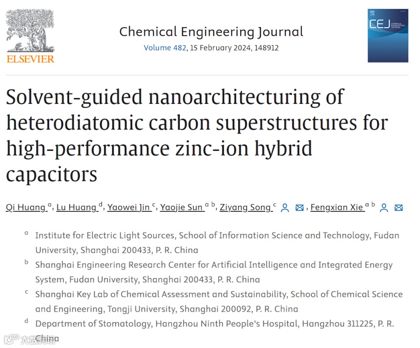 近日,复旦信息学院解凤贤研究员与同济大学化学科学与工程学院宋子洋博士合作,使用聚酰亚胺前驱体与不同溶剂相互作用诱导纳米结构,以定制多功能二元异质碳超纳米结构(CS)作为碳阴极材料,揭示ZHCs的高效输出源于CS碳电极中的阴阳离子(Zn2+/OTF−)的交替存储。相关成果以“Solvent-guided nanoarchitecturing of heterodiatomic carbon superstructures for high-performance zinc-ion hybrid capacitors”为题发表于国际工程领域期刊《化学工程杂志》(Chemical Engineering Journal)。上述研究工作得到了国家自然科学基金委、上海市科委、中国博士后科学基金会和杭州市卫生科技计划项目资助,复旦大学、同济大学和杭州市第九人民医院提供了硬件支持。同济大学宋子洋博士、复旦大学解凤贤研究员为论文共同通讯作者,杭州市第九人民医院黄璐博士、同济大学研究生金耀威为论文合作者,复旦信息学院博士生黄淇为论文第一作者。