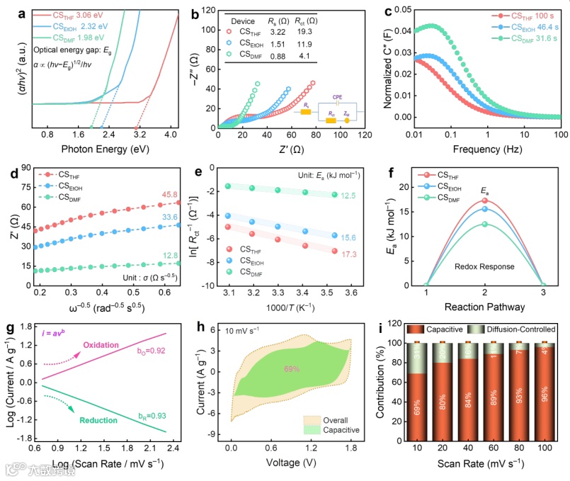 动力学分析验证了CSDMF基电容器电极光学能隙最小、电化学阻抗最小、活化能势垒最低,具有最快的动力学响应速度。