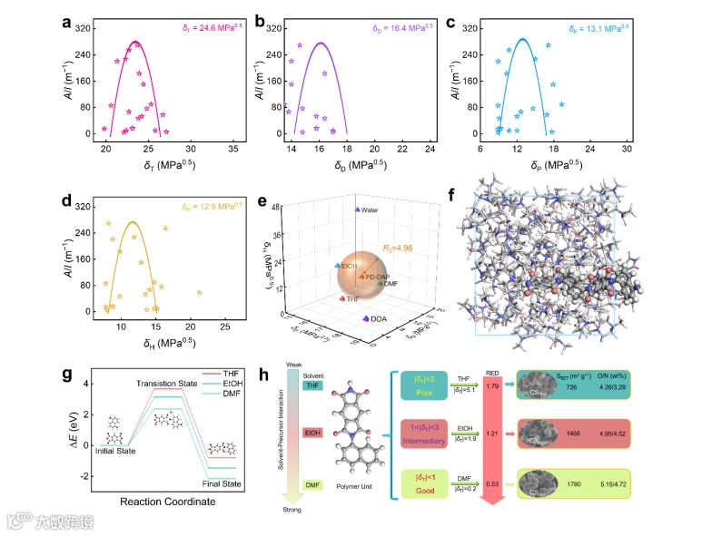 基于汉森溶解度参数模型(HSPs)和分子动力学模拟(MD),调节溶剂与前驱体的相互作用可促进聚合物中间体的热力学溶解和生长动力学,从而定制球形多功能二元异质碳超纳米结构。