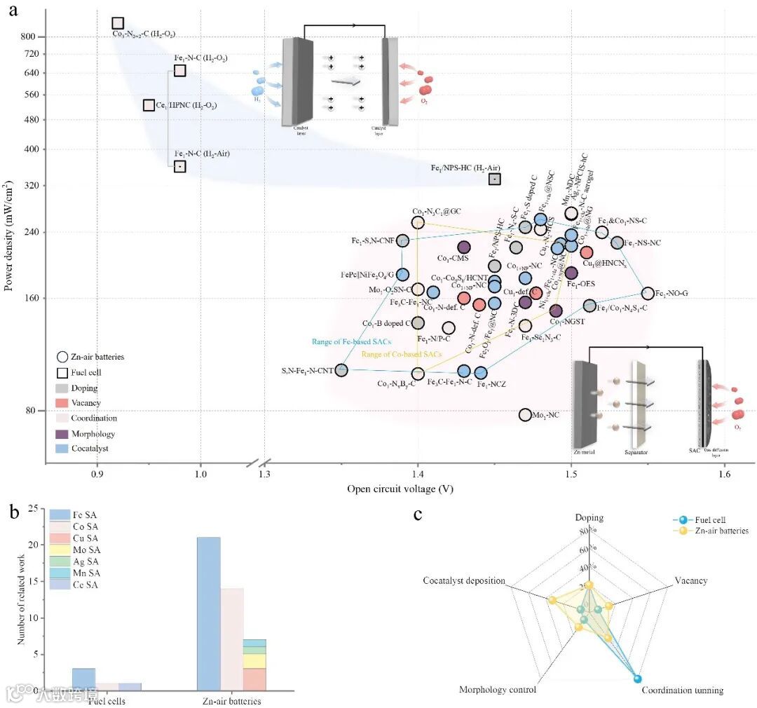 图10. 表面工程SACs用于锌空气电池和PEMFCs器件的性能比较。