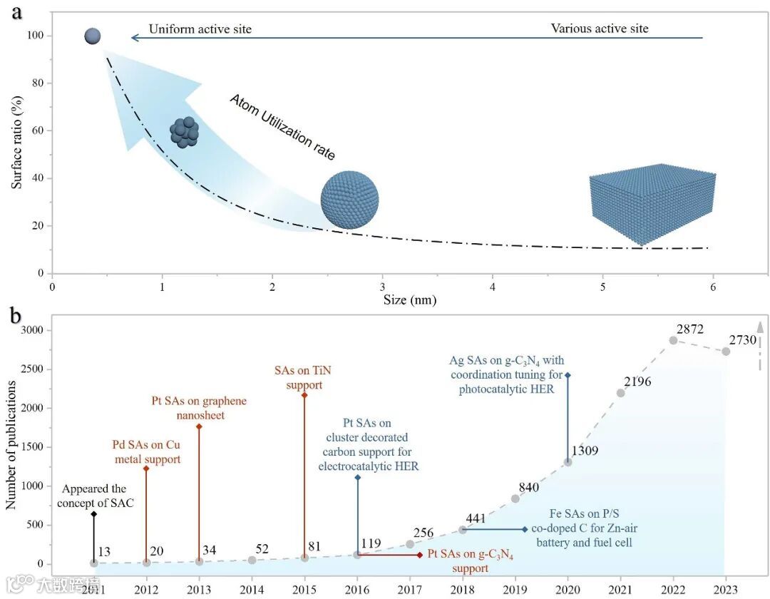 图3. SACs与其他催化剂的对比以及表面工程单原子材料的发展。
