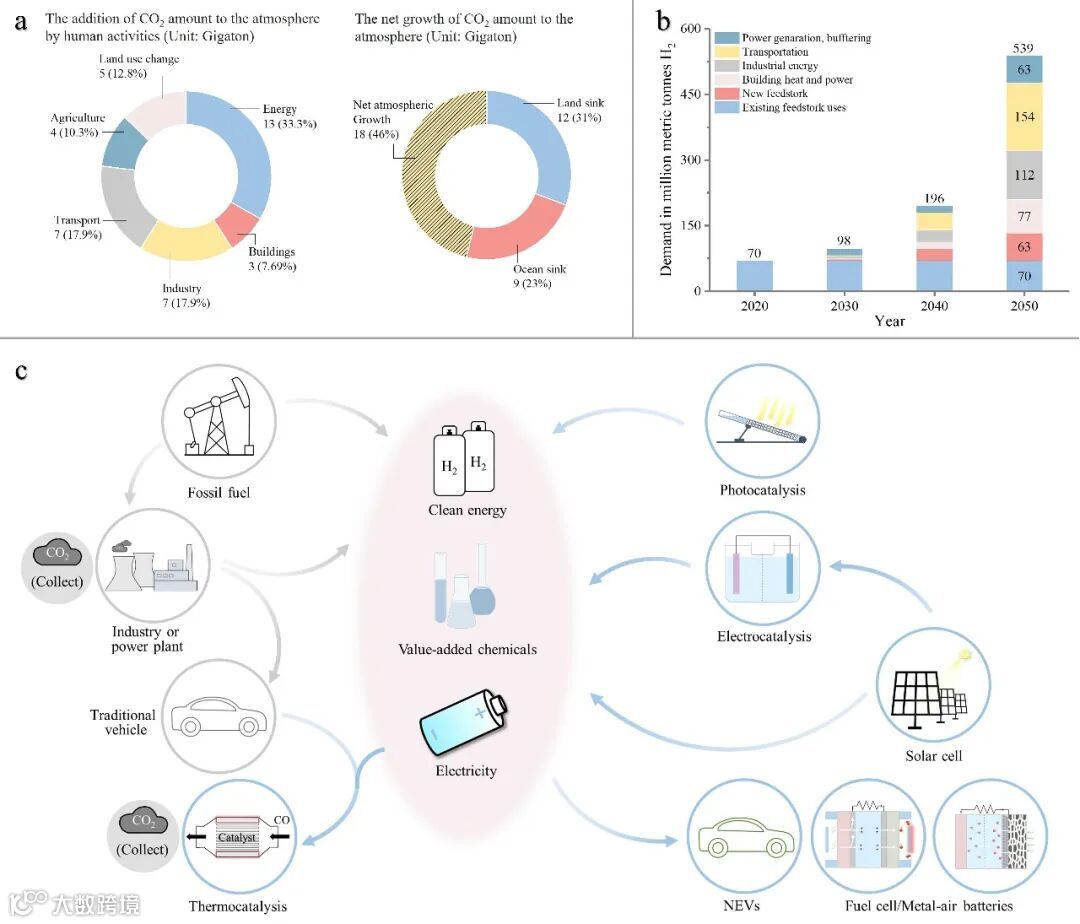 图2. (a)人类活动所排放的二氧化碳量,以及向大气排放的二氧化碳量的净增长量。(b)预测全球对氢气的需求。(c)利用各种清洁能源转换技术实现环境友好的未来。