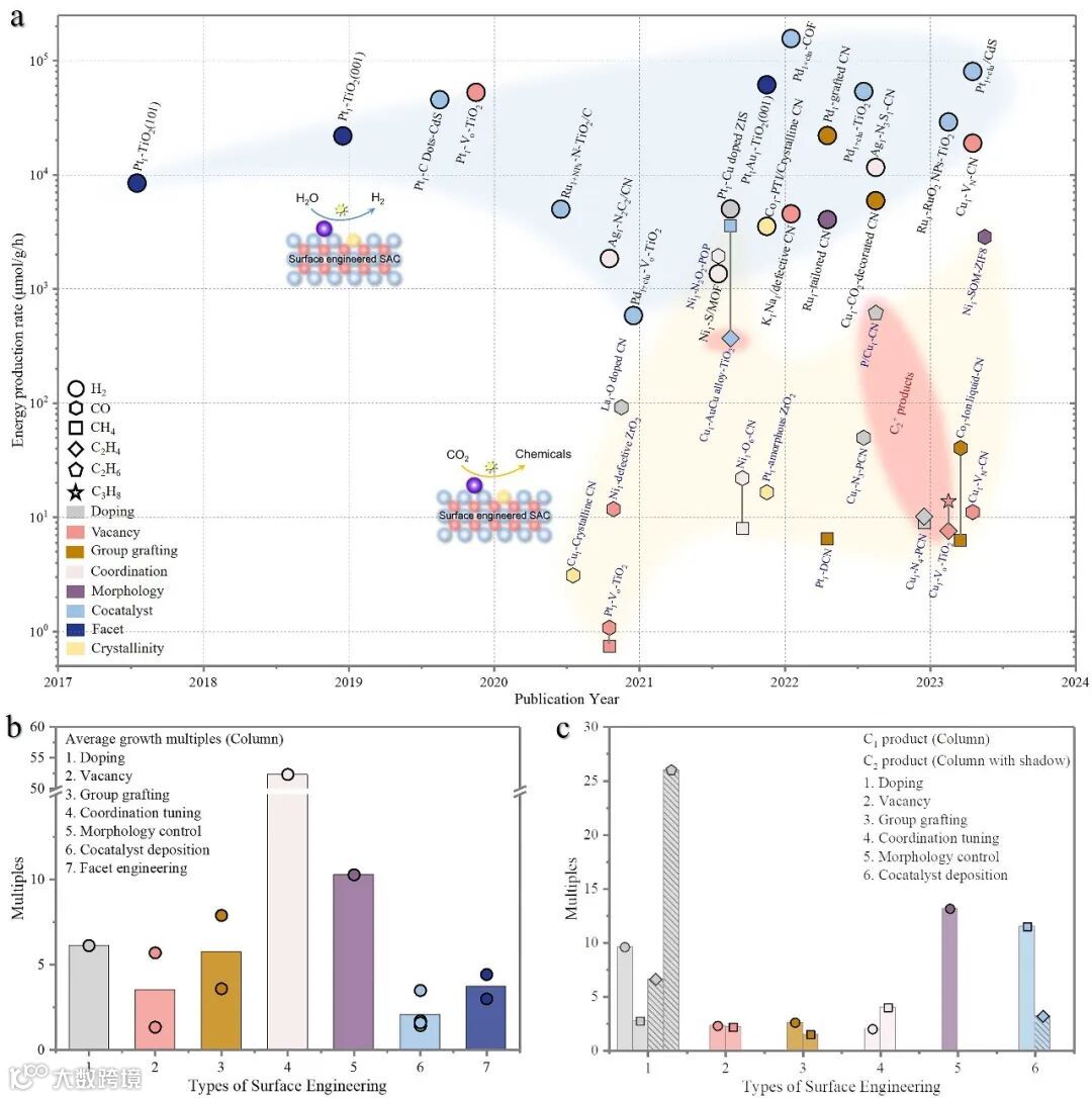 图7. 不同表面工程策略下光催化析氢和CO2还原效率的比较。