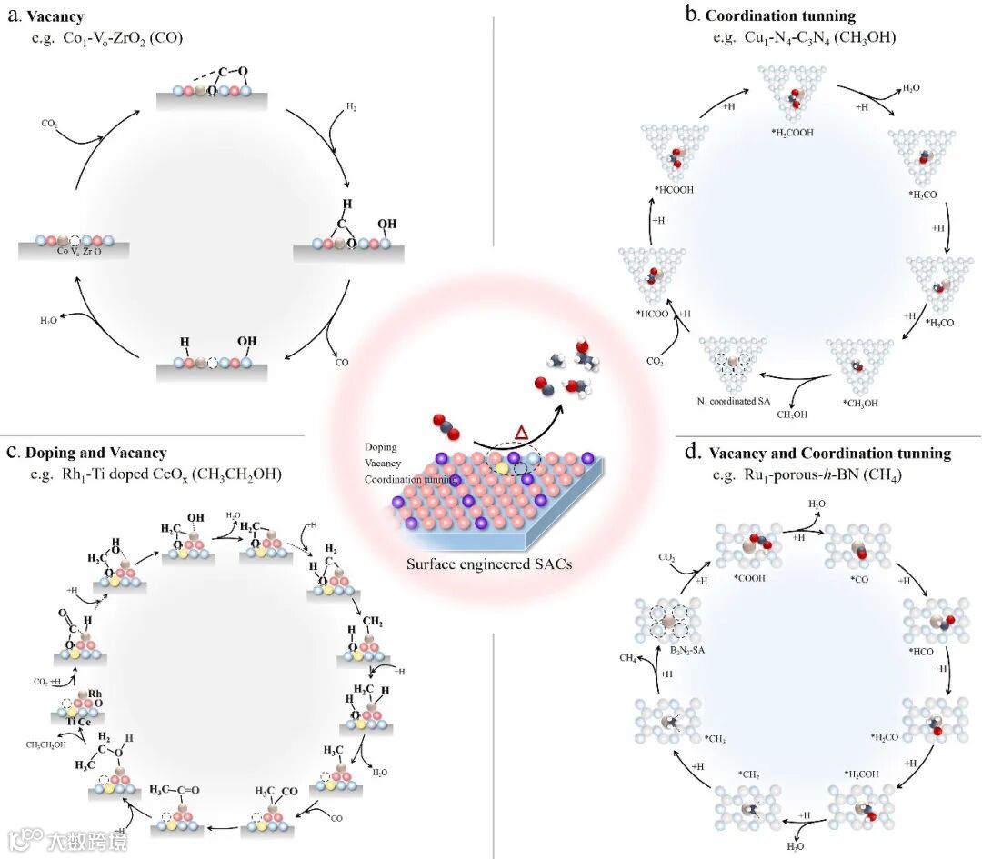 图9. 表面工程的SACs用于热催化CO2还原的一些反应路径。