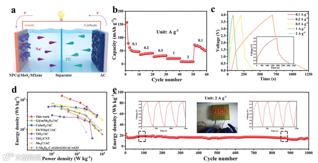 NPC@MoS2/MXene的快速离子扩散动力学和长循环稳定性使其成为一种很有前途的SICs阳极材料。图5c中的近线性曲线表明了SICs的快速离子存储动力学。图5d中的Ragone图显示,在功率密度为254 W kg−1的情况下,获得了136 Wh kg−1的超高能量密度。当功率密度增加到5940 W kg−1时,组装后的SICs仍然可以提供27 Wh kg−1的高能量密度。值得注意的是,制备的SICs在2000 mA g−1的高电流密度下具有良好的循环性能,在1000次循环后具有23 Wh kg−1的高能量密度。电压与时间图(插入图5e)进一步证实了这种SICs对其他高功率密度器件的可能应用。