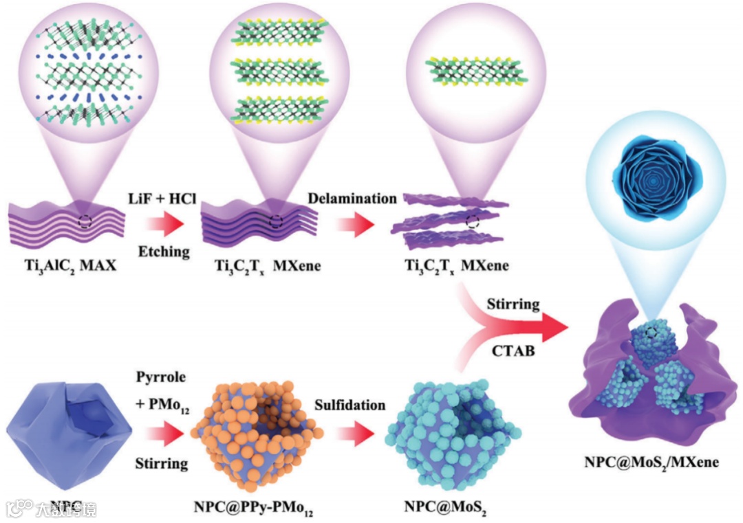 图1. NPC@MoS2/MXene的合成工艺示意图。