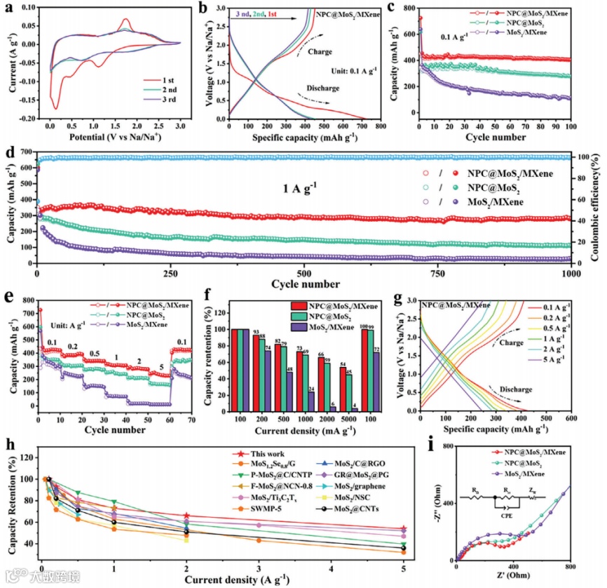 在1000 mA g-1的电流密度下,研究了三种电极的长循环稳定性,如图3d所示。即使在1000 mA g−1下进行1000次循环,NPC@MoS2/MXene仍然表现出279 mAhg-1的可逆容量,容量衰减仅为0.021%。改变电流密度分别为100、200、500、1000和2000 mA g-1时,分别获得了428、393、346、316和289 mAhg−1的高可逆容量。即使在5000 mA g-1的电流密度下,NPC@MoS2/MXene仍然保持了239 mAhg-1的高容量。当电流密度下降到100 mA g-1时,容量立即恢复到428 mAhg−1,表明NPC@MoS2/MXene的结构稳定。