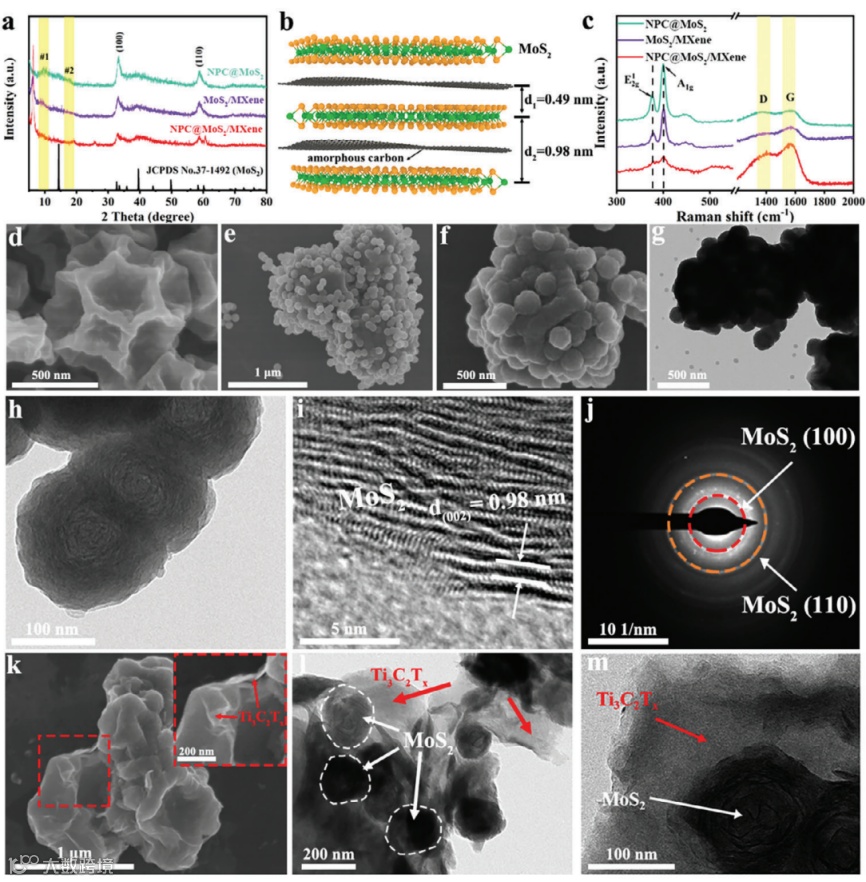 合成的NPC@MoS2、MoS2/MXene和NPC@MoS2/MXene样品的x射线衍射(XRD)图如图2a所示。在所有合成样品中,均清晰地观察到二硫化钼(JCPDS 37-1492)的(100)和(110)平面对应的衍射峰,表明PPy-PMo12成功硫化。值得注意的是,与MoS2层堆叠相关的(002)晶面衍射峰减弱甚至消失,这表明合成的二硫化钼具有单层/少层结构。在2θ=17.8°处(标记为#1)和9.0°处(标记为#2)均观察到新的衍射峰。根据布拉格定律,峰#1和峰#2的d-间距分别为0.49和0.98 nm。考虑到二硫化钼和碳层的d间距分别为0.62和0.34 nm,很可能ppy衍生的非晶碳插入二硫化钼库(如图2b所示)。峰#1对应碳到二硫化钼层的距离,峰#2对应相邻二硫化钼层与碳之间的距离。图2i中的HR-TEM图像显示二硫化钼层的堆叠明显减少,表明只有少数层存在几层。此外,测量到的二硫化钼层的d-间距(0.98 nm)与XRD的结果一致,并证实了碳层被插入到二硫化钼图库中。图2k中的SEM图像显示了MXene层成功地包裹在NPC@MoS2单元外围。边缘的TEM图像进一步证实了MXene层与NPC@MoS2之间的强互连。