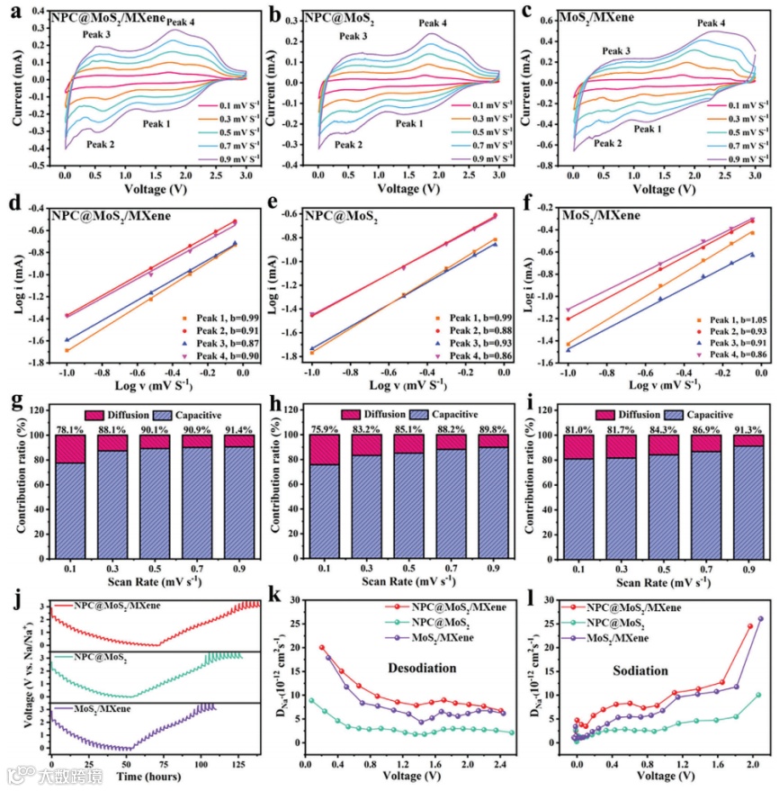 利用CV曲线对电极的电化学动力学进行了研究。显然,三种电极在嵌钠/脱钠过程中存在很高比例的电容行为。值得注意的是,MoS2/MXene的电容行为主要源于MXene中的高离子电导率和丰富的氢氧基团,作为电荷转移的氧化还原位点。相比之下,虽然NPC@MoS2/MXene的表面积低于NPC@MoS2,但外表面MXene层的引入促进了氧化还原反应,形成了更明显的电容主导过程。在高电流密度下,NPC@MoS2/MXene的嵌钠/脱钠过程主要受赝电容贡献的控制,从而具有良好的可逆性和倍率能力。与NPC@MoS2样品相比,MoS2/MXene在嵌钠和脱钠过程中均表现出较低的电压波动,表明动力学势垒降低。这一观察结果证实了MXene外层在改善电极扩散动力学方面的积极作用。NPC@MoS2/MXene样品表现出最快的Na+扩散动力学,这归功于二硫化钼、NPC和MXene的协同效应。在整个嵌钠/脱钠过程中,NPC@MoS2/MXene和MXene和NPC@MXene始终表现出最高的Na+扩散系数。