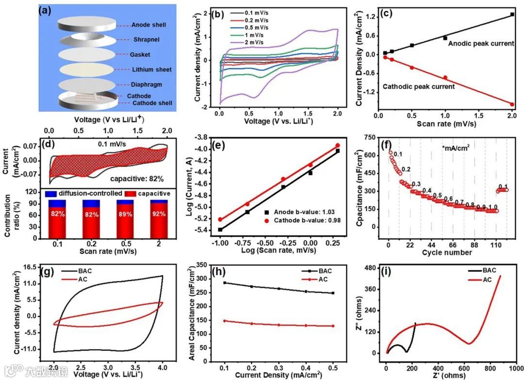 该工作采用CoMoO4/RGO复合材料作为负极材料,具有高孔隙结构的竹源活性炭BAC作正极材料。在半电池中,一系列的动力学过程实验表征表明,CoMoO4/RGO的电化学过程主要为表面诱导的赝电容行为,表现出669.2 mF/cm2 (371.8 μAh/cm2)的高面积比电容。而BAC则表现为双电层电容行为。与商用活性炭AC相比,BAC具有更高的面积比容和优异的倍率性能。在0.1 mA/cm2的电流密度下,其面积比容量为286.2 mF/cm2;当电流密度提升至0.7mA/cm2时,仍可保持243.92 mF/cm2的面积容量。这是由于其具有更多的孔隙结构,从而具有更大的比表面积,更小的电荷转移电阻和更好的锂离子扩散能力。