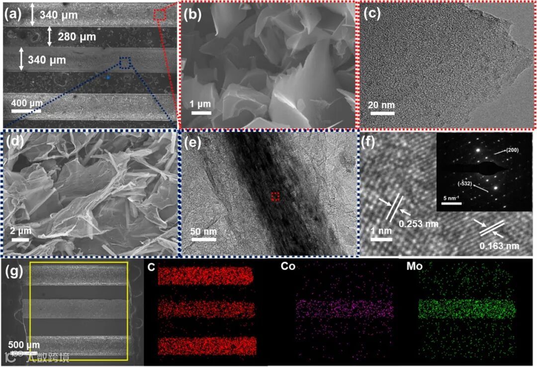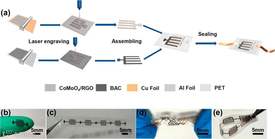 通过激光加工技术可以很好的实现器件的图案化和微型化。由于激光的高精度,LIMC单个手指宽度和电极间隙仅为340 µm和280 µm,所制备的单个储能器件面积仅为0.1251 cm2。同时激光切割和组装策略可以在PET柔性基底表面实现集成,在满足需要不同电压阈值的各种电子设备的需求方面具有巨大的潜力。得益于其良好的柔韧性,即使在扭转、弯曲状态下也能保持其完整性。