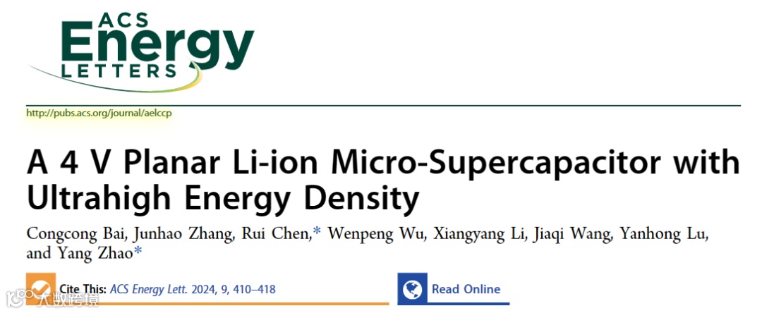 近日,来自北京理工大学的赵扬特别研究员、陈瑞博士等人在国际知名期刊ACS Energy Letters上发表题为“A 4 V Planar Li-ion Micro-Supercapacitor with Ultrahigh Energy Density”的文章。该文章通过激光辅助策略,采用预锂化的CoMoO4/RGO和竹源活性炭BAC分别作为电池型和电容型电极,组装了平面型锂离子微型超级电容器(LIMCs)。得益于正极表面快速的离子吸脱附过程和负极表面的多电子氧化还原反应,LIMC具有4 V的宽工作电位窗口,135.4 mF/cm2(150.4 μAh/cm2)的高面电容以及可达301 μWh/cm2(256 mWh/cm3)的能量密度。廊坊师范学院卢艳红教授对本文给予了重要的建议和指导。