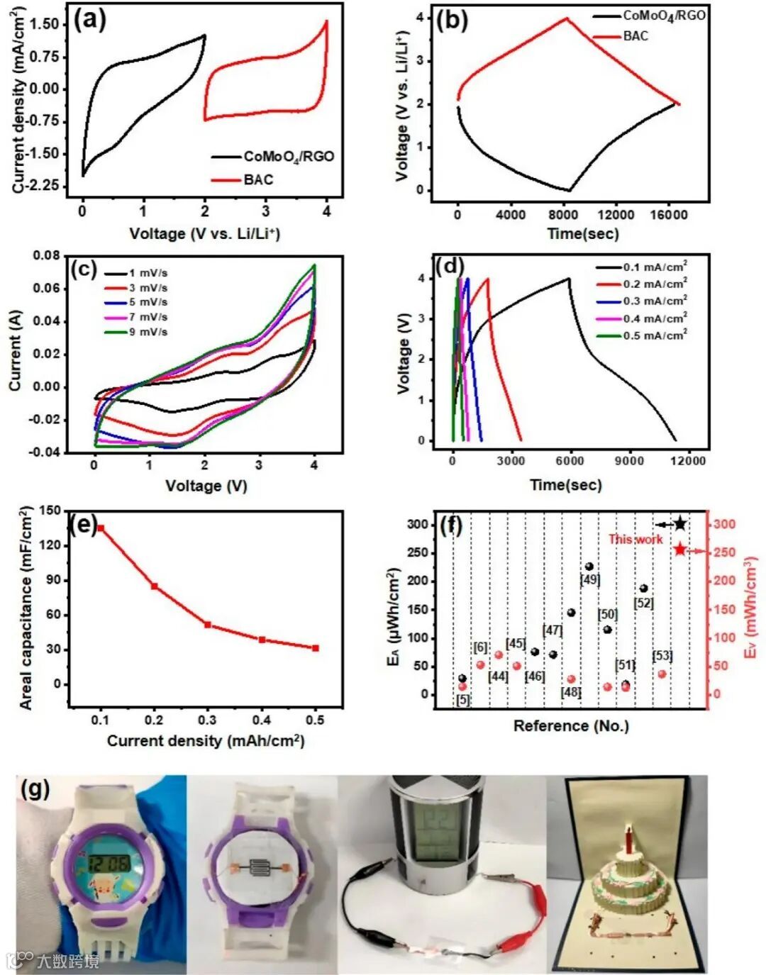 将CoMoO4/RGO叉指电极组装半电池在低电流密度下进行放电实现预锂化过程。预锂化的CoMoO4/RGO负极具有快速的反应动力学能力,同时BAC正极的具有高比表面积的多孔结构,两者相匹配的锂离子微型电容器表现出4V的宽工作电压窗口和135.4 mF/cm2(150.4 μAh/cm2)的高面电容。其面积能量密度可达301 μWh/cm2,优于大多数微型金属离子混合电容器。该LIMC可以驱动手表、笔筒、电子贺卡等各种不同电压阈值的电子产品,例如充电15分钟可为电子手表供电2小时。