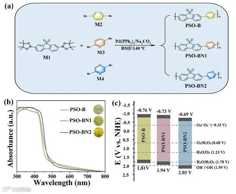 成功地设计并合成了三种新型共轭聚合物PSO-B,PSO-BN1和PSO-BN2,用于光催化产H2O2。其光带隙分别为2.68、2.60和2.59 eV。另外,PSO-B、PSO-BN1和PSO-BN2的LUMO/HOMO能级分别为−0.76/1.81 V、−0.73/1.94 V和−0.69/2.03 V。在热力学上,三种聚合物均可以通过2电子ORR(E(O2/-O2-) = −0.33 V))途径产生H2O2,也满足2电子WOR(E(H2O/H2O2=1.76 V)直接生成H2O2的条件。因此,这三种聚合物可以作为光催化材料,可以实现光催化双通道产H2O2。