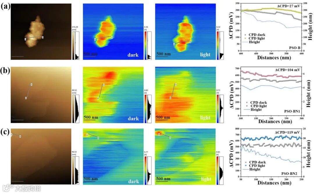 采用KPFM研究了三种聚合物的表面电位变化。材料被光激发后电子-空穴对发生分离,导致光照前后的接触电位差(ΔCPD)发生了变化,从而产生了表面光电压。其中,PSO-BN2的ΔCPD值最大,具有最高的表面光电压。这一结果表明,PSO-BN2具有更有效的光诱导载流子分离和迁移效率。