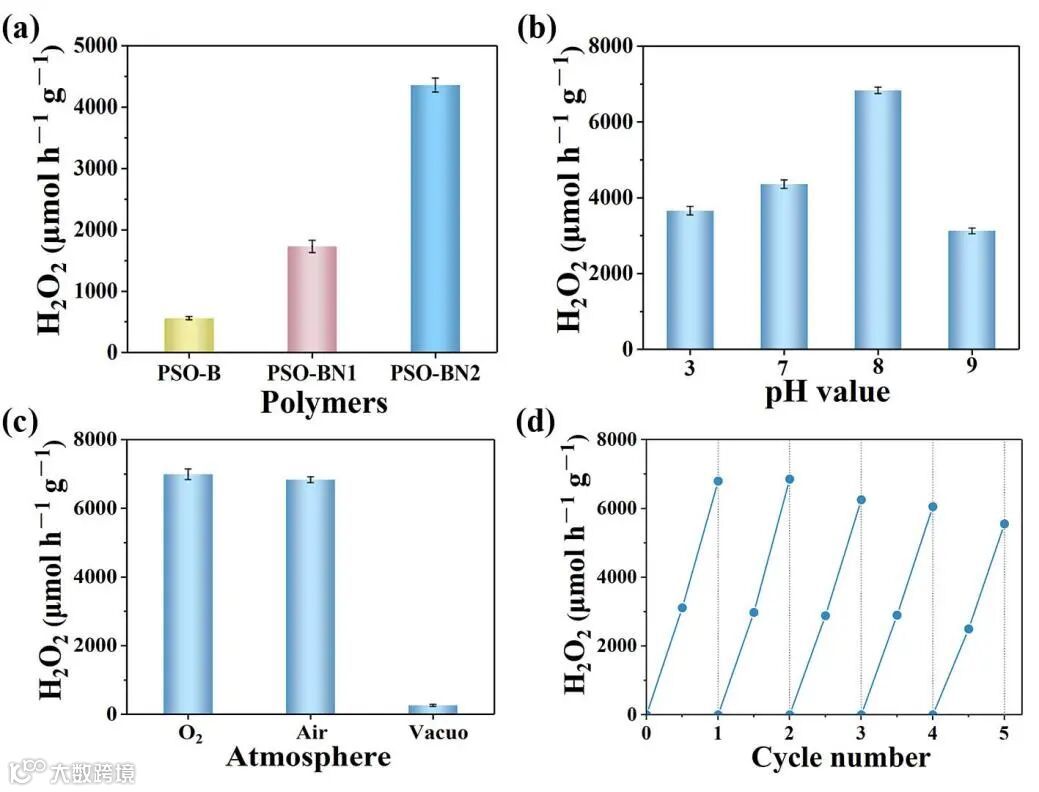 当二苯并噻吩砜基聚合物骨架结构中的C-H被N原子取代时,得到的富N聚合物的光催化H2O2生成速率明显提高。其中,PSO-BN2光催化性能最佳,当溶液的pH为8时,PSO-BN2光催化产H2O2的效率高达6996 μmol h−1 g−1,并且具有良好的循环稳定性。这可能是因为弱碱性溶液中的OH−可以被空穴氧化生成H2O2。有趣的是,与纯O2条件下相比,PSO-BN2在空气条件下的光催化活性几乎没发生明显的变化,说明PSO-BN2可以最大限度地利用水中的溶解O2进行光催化产H2O2。