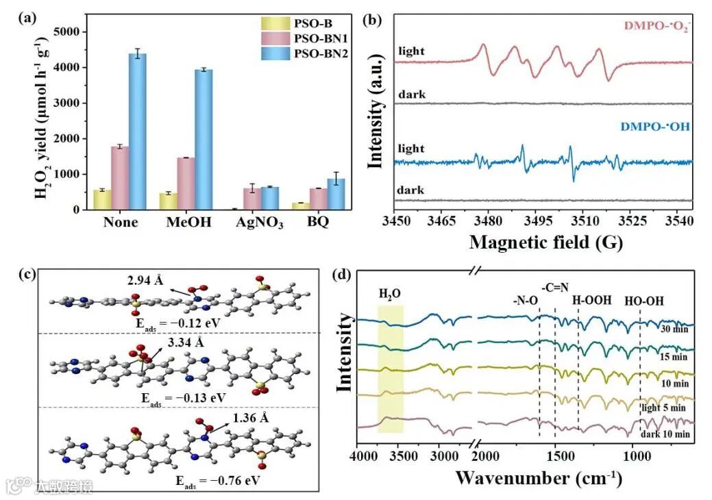 机理研究证明PSO-BN2可以实现连续单电子和直接2电子的ORR反应,同时PSO-BN2可以氧化OH−产生的•OH自由基,随后•OH相互结合生成了一定量的H2O2,实现了光催化ORR和WOR协同生成H2O2。DFT计算证实N原子为O2吸附的活性位点,说明在PSO-BN2骨架结构中引入吡嗪单元可以促进光生电子从PSO-BN2向O2转移,从而形成有效的H2O2生成途径。另外,原位FT-IR测试进一步证实了N为反应活性位点,PSO-BN2光催化产H2O2是通过H2O氧化反应和O2还原反应的协同作用实现的。