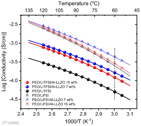 Figure 2. Summarized Arrhenius plot for the composite LiTFSI and LiFSI PEO electrolytes filled with Al-LLZO. The electrochemical testing was performed at 60 oC (dotted line on the plot).