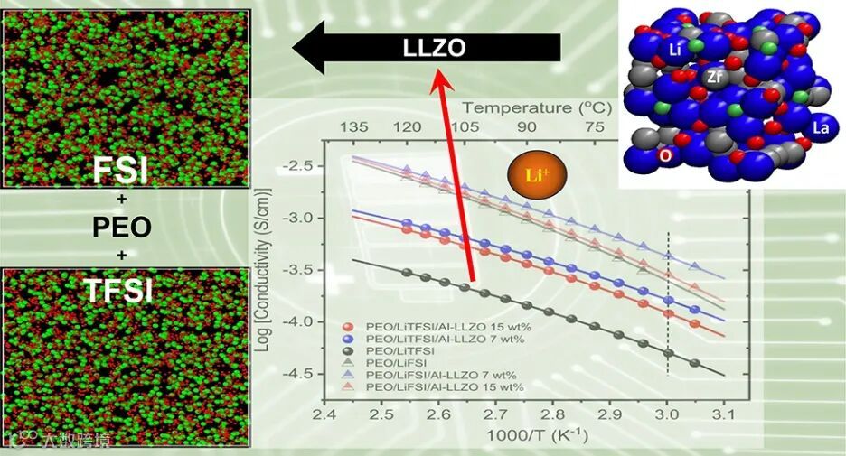 作者使用填充有双(三氟甲磺酰基)亚胺锂(LiTFSI)或双(氟磺酰基)亚胺锂(LiFSI)盐的聚环氧乙烷(PEO)作为基质。此外,具有平面几何形状的石榴石电解质、铝取代的锂镧锆氧化物(Al-LLZO)被用于陶瓷纳米颗粒部分。