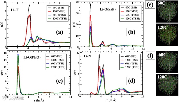 Figure 5. Structural behavior of Li+ ions. Radial distribution function (RDF) of Li+ with respect to (a) fluorine, (b-c) oxygen of salt and oxygen of PEO at two different temperatures, 60 ºC and 120 ºC. (d) Li+ with nitrogen atoms of salt. (e) and (f) snapshots showing LiFSI and LiTFSI respectively. For clarity only Li+ and Li+ salts are shown.