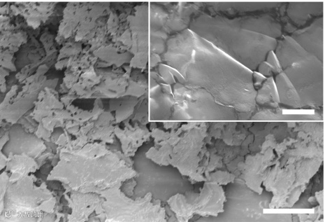 Figure 1. SEM image of the electrospun Al-LLZO platelets. The scale bar is 10 µm. The inset shows a cross-sectional SEM image of a composite PEO electrolyte filled with 15 wt% Al-LLZO. The scale bar is 4 µm.