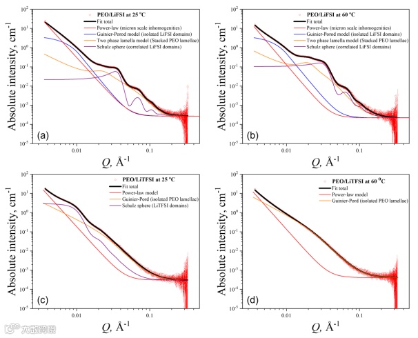 Figure 4. Experimental SAXS patterns and model-fits of the (a, b) PEO/LiFSI electrolytes at 25 oC and 60 oC. (c, d) PEO/LiTFSI electrolytes at 25 oC and 60 oC. The SAXS model-fits were based on multiple SAXS model functions as indicated in each plot. The fitting parameters of the SAXS functions that were used to fit the scattering curves are summarized in the Supporting Information.