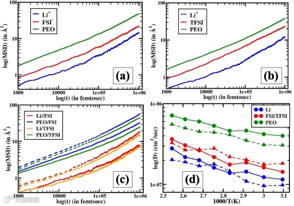 Figure 6. The mean-square-displacement (MSD) and diffusivities of the Li+, FSI/TFSI anions, and PEO chains. (a) Comparison of Li+, FSI and PEO MSDs for LiFSI samples at 50 ºC. (b) Comparisons of Li+, TFSI and PEO MSDs for LiTFSI sample at 50 ºC. (c) Comparison of Li+ and PEO dynamics (MSDs) for LiFSI and LiTFSI at 50 ºC (solid lines) and 120 ºC (dashed lines) respectively. The color schemes are shown in legends. (d) Diffusivity, calculated from Einstein’s relation, of Li+, FSI/TFSI and PEO chain. The circles (solid lines) and triangles (dashed lines) represent LiFSI and LiTFSI samples respectively.