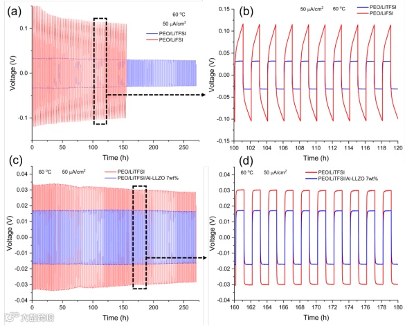 Figure 7. Comparison of the long term galvanostatic cycling of the (a, b) LiFSI and LiTFSI electrolytes and (c, d) LiTFSI and LiTFSI composite filled with 7 wt% Al-LLZO at 60 oC and 50 µA/ cm-2.