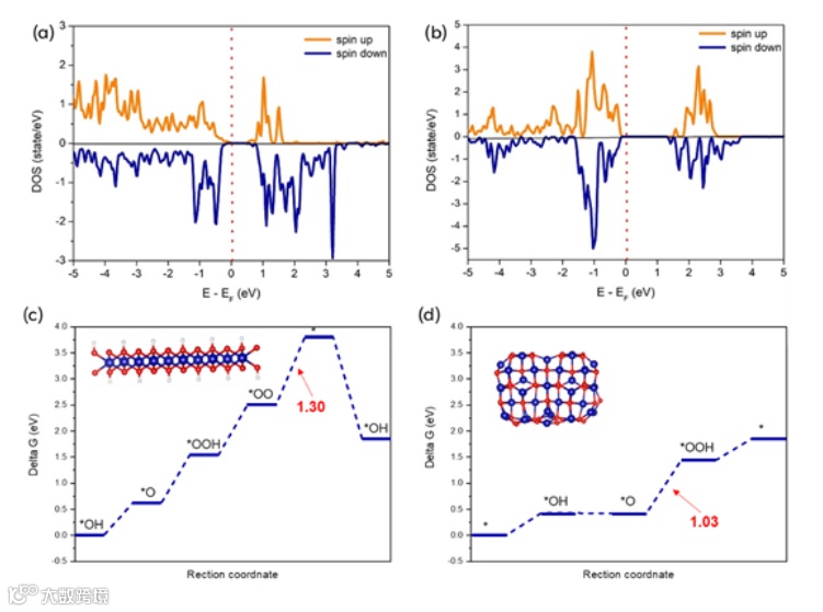 经由LICL在OER过程中调控活性物质形成的独特Co3O4纳米簇,其具有更多的高自旋态Co离子,这促进了电子的传输并带来更强的*OOH相互作用。相较于其他样品中的CoOOH,Co3O4纳米簇有着更低的能垒(1.03 Vs. 1.30),并实现了自发的O2释放步骤。