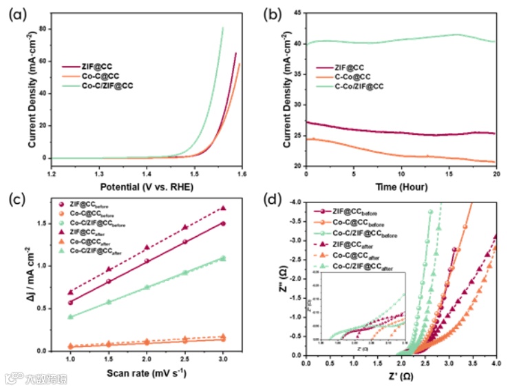 具有独特LICL结构的Co-C/ZIF@CC有着最低的过电势和最高的稳定性,并且经过20小时稳定后的电流值是未处理样品ZIF@CC与传统炉子处理样品Co-C@CC的近两倍。在OER过程中,LICL可以确保最小的电化学面积变化,并且带来更低的电阻与更快的氧化还原物质扩散速率。