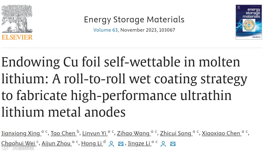 近日,电子科技大学李晶泽教授课题组等人提出了一种将熔融锂液直接涂覆到加热铜箔上辊对辊制备超薄金属锂箔的简便方法。作者指出,适宜的温度条件能够加速熔融锂和铜箔之间的合金化反应,极大改善熔融锂和铜箔之间的浸润性,使得熔融锂能够在铜箔表面快速浸润,达到均匀铺展制备超薄锂箔的效果。该成果以“Endowing Cu Foil Self-Wettable in Molten Lithium: A Roll-to-Roll Wet Coating Strategy to Fabricate High-Performance Ultrathin Lithium Metal Anodes”为题发表在了Energy Stroge Materials上,邢健雄是本文第一作者。