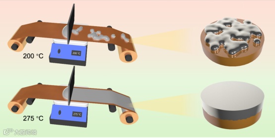 铜箔具有优异的导电性、较高的结构/电化学稳定性和低廉的价格,因此通常被用作锂离子电池或锂金属电池的负极集流体。同时,金属锂(180.5℃)和金属铜(1083.4℃)熔点差异大,通过在铜箔表面涂覆熔融锂液态金属来实现超薄锂金属的制备是一个可行的方法。然而,熔融锂在未加热的铜箔上的浸润性较差,很难将熔融锂在铜箔表面均匀铺展开来。本研究通过调控铜箔表面的温度,促进原位的锂铜合金化反应以提高熔融锂与铜箔之间的浸润性