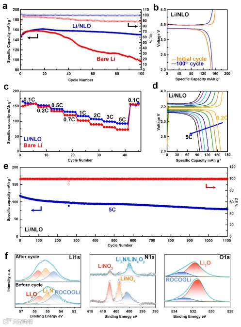 NLO锂负极在磷酸铁锂作为正极的锂金属电池中表现出了良好的稳定性,相较于未保护锂金属负极,NLO锂负极在0.1 C的电流下稳定循环了100个周期,于此同时其库伦效率始终保持在99 %以上,而未保护锂金属负极的库伦效率降至了90%,这进一步验证了NLO阳极氧化膜对于锂枝晶生长的抑制作用。在5C的高电流密度下, 应用了NLO锂负极的电池稳定循环了超过1100个周期,其容量保持率为68.5%。通过XPS 分析得知,在循环过程中,原阳极氧化时残留的亚硝酸锂持续反应,在NLO 阳极氧化膜中生成更多的氮化锂,进一步增加锂离子的传导率。这种锂离子传导率的提升对于提高电池的稳定性起着正向作用。