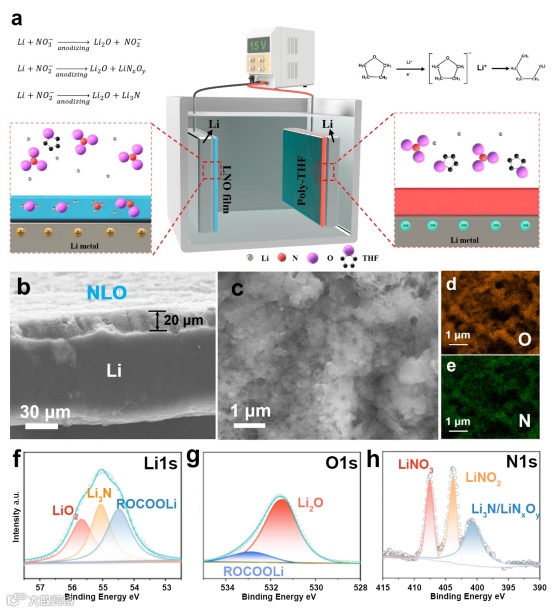 该工作首次利用四氢呋喃和硝酸锂在液体电解质中对纯锂进行阳极氧化。利用这种新工艺,可以在阳极氧化过程中获得原位氮掺杂且厚度可控的氧化锂膜。所得到的氮掺杂锂氧化物膜(NLO)在锂金属阳极上呈现出均匀表面,同时提高了锂离子的传导率,有效地抑制了锂枝晶的生长。此外,具有Li/NLO阳极的锂金属全电池在5C下实现了1100次循环的稳定寿命。更重要的是,这项工作证明了NLO膜作为固态电解质在固态锂金属电池中的巨大潜力。具有NLO膜的对称锂金属电池在2 mA cm−2电流密度下表现出优异的300 h稳定循环,其在室温下的锂离子传导率高达~3×10−4 S cm−1。这项研究不仅提供了一种新的锂阳极氧化工艺和稳定的锂金属阳极,而且为发展新型固态锂金属电池技术开辟了新的可能性。