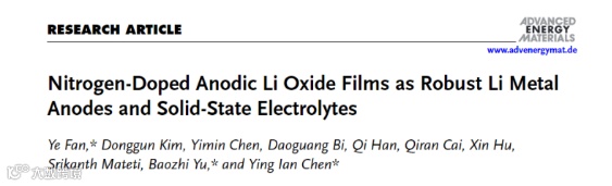 近日,迪肯大学的范烨博士,余宝智博士,陈英教授课题组,在国际知名期刊Advanced Energy Materials上发表题为“Nitrogen-Doped Anodic Li Oxide Films as Robust Li Metal Anodes and Solid-State Electrolytes”的研究工作。
