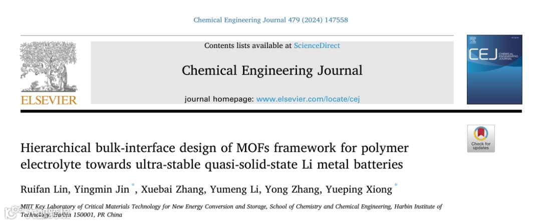 近日,来自哈尔滨工业大学的熊岳平教授与金英敏助理教授团队在国际知名期刊Chemical Engineering Journal发表题为“Hierarchical bulk-interface design of MOFs framework for polymer electrolyte towards ultra-stable quasi-solid-state Li metal batteries”的研究论文。硕士研究生林锐帆为论文第一作者,熊岳平教授、金英敏助理教授为论文共同通讯作者。