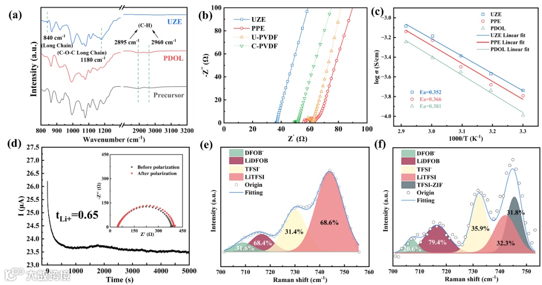图 3 (a) UZE、PDOL 和 DOL 前体的 FT-IR 光谱,(b) C-PVDF、U-PVDF、PPE 和 UZE 的交流阻抗谱,(c) PDOL、PPE 和 UZE 的阿伦尼乌斯图,(d) UZE的锂离子迁移数、(e) PPE 和 (f) UZE 的拉曼光谱