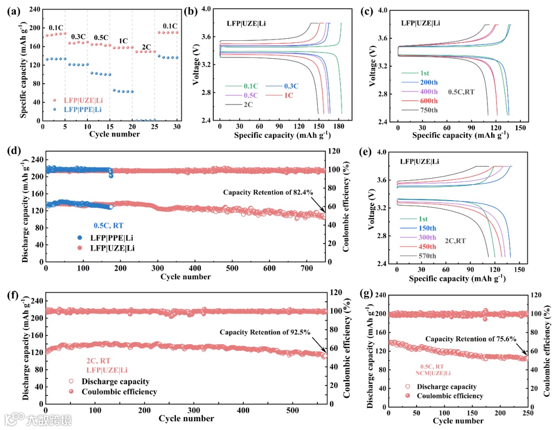 图 7原位聚合锂电池的室温循环性能,(a)Li||LFP电池的倍率性能和(b)不同倍率下的相应电压曲线,Li||LFP电池在 0.5C 下的电压曲线(c)和循环性能(d),Li|UZE|LFP 电池在 2C 下的电压曲线(e)的循环性能(f), (g) Li|UZE|NCM 电池在 0.5C 下的循环性能。